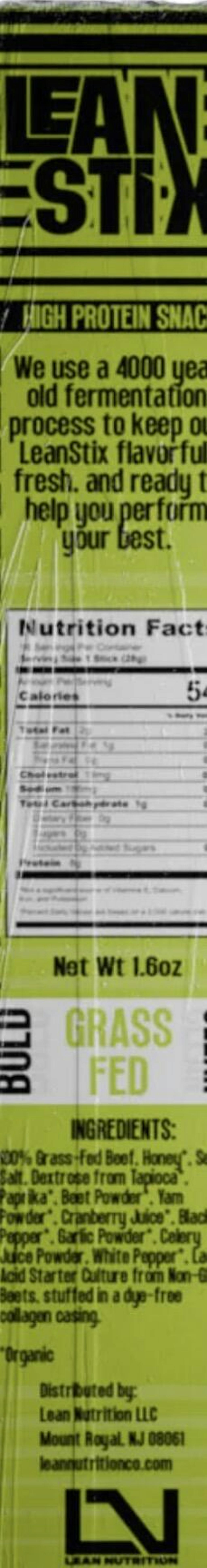Ingredients: 100% Grass-Fed & Finished Beef, Honey*, Sea Salt, Dextrose from Tapioca*, Paprika*, Beet Powder*, Yam Powder*, Cranberry Juice*, Black Pepper, Garlic Powder*, Celery Juice Powder, White Pepper*, Lactic Acid Starter Culture from Non-GMO Beets stuffed in a dye free collagen casing.